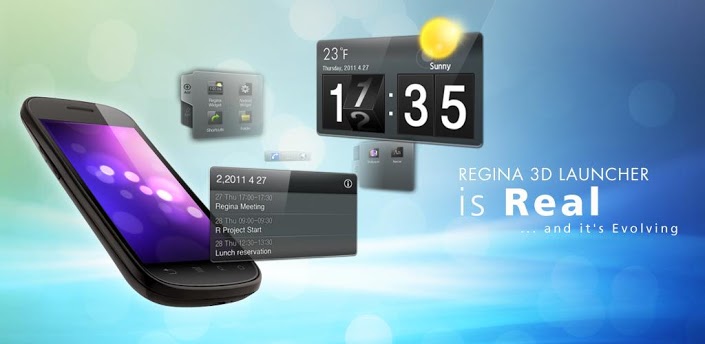 Regina 3D Launcher is a 'Home Replacement Application' which uses pure 3D graphics showing various dynamic 3D effects for your pleasure.